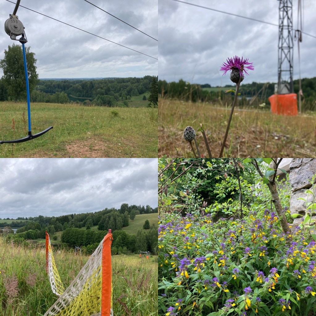 Zum Ārdavs ist zum Teil Treideln angesagt. Durch die trockenen letzten Monate fehlt dem Kanal dorthin das Wasser, um uns rüberzutragen. Der Ārdavs hat so viele Buchten, Nasen und Halbinseln, dass wir ihn nicht ganz auspaddeln, sondern uns nur den Zufluss der Dubna aus dem Sīvers und den Abfluss (mit Rastplätzchen) zum Lejs (da waren wir schon) angucken. Der sonnige Feierabend auf Aimasas Kempings lockt. Vorher aber Auto-hol-Spaziergang nach Saulekalns durch wunderschön-sommerblumige Wiesen in fein-hügeliger Endmoränen-Landschaft.