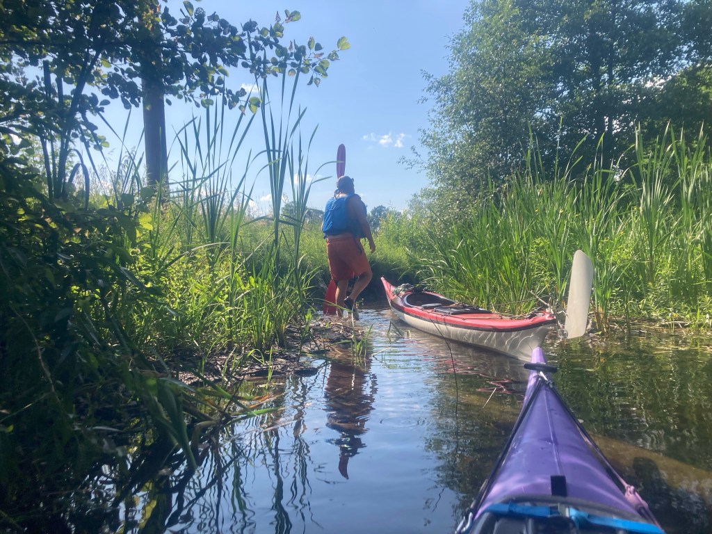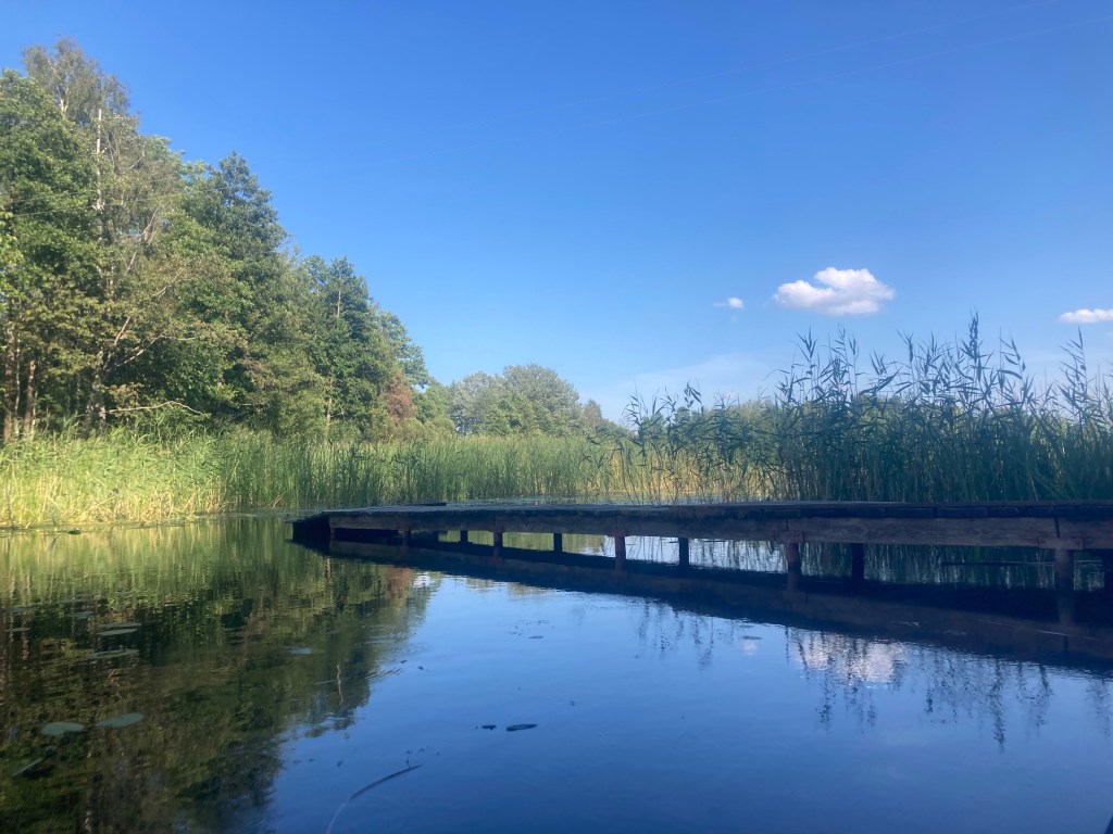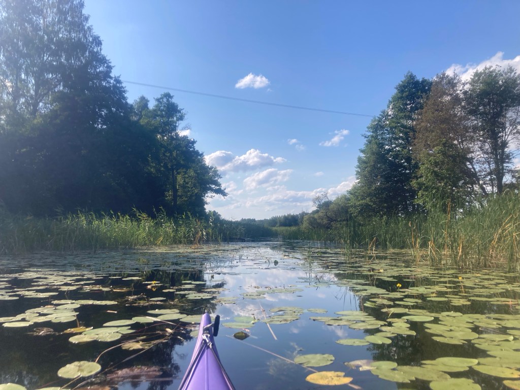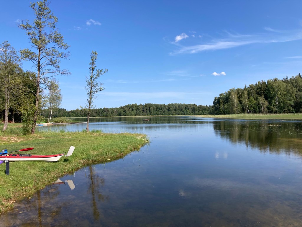 Wir suchen stattdessen den kleinen Kanal, der uns in den kleinen See Ots bringen soll. Wir suchen! Und finden: feels like African Queen. Der Ots: einsam, ruhig, flacher, von Wald umgeben: sieht wie Lappland aus. Und verwinkelt: im hintersten Winkel soll es einen Kanal zum Ārdavs geben, der diesmal viel leichter zu finden ist: an der Mündung ein Hof und eine Zeltwiese, Aimasas Kempings, wo man uns den Rat gibt umzutragen: eine kleine Steinstufe. Der Platz liegt so lauschig, dass wir die Idee, den Rückweg hier zu beenden, sofort großartig finden. Da wir bis hierher fast einen Kreis gepaddelt sind, muss der Bulli nur über knapp 2km nachgeholt werden.